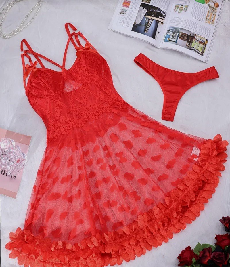 2 قطعة مجموعة نوم ساتان للنساء، فستان لانجري شفاف مثير بحافة مكشكشة، ربطة، تطريز دانتيل، قماش شبكي بدون أسلاك، سروال ثونغ V-String، هدية عيد الحب