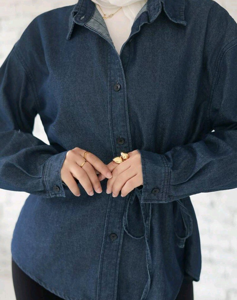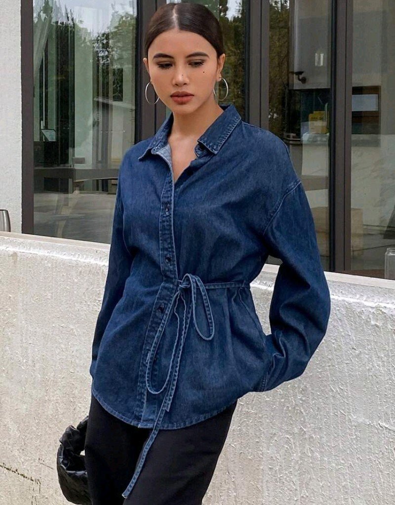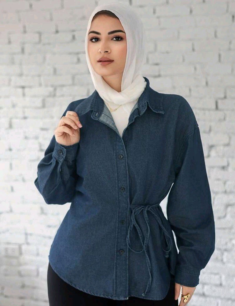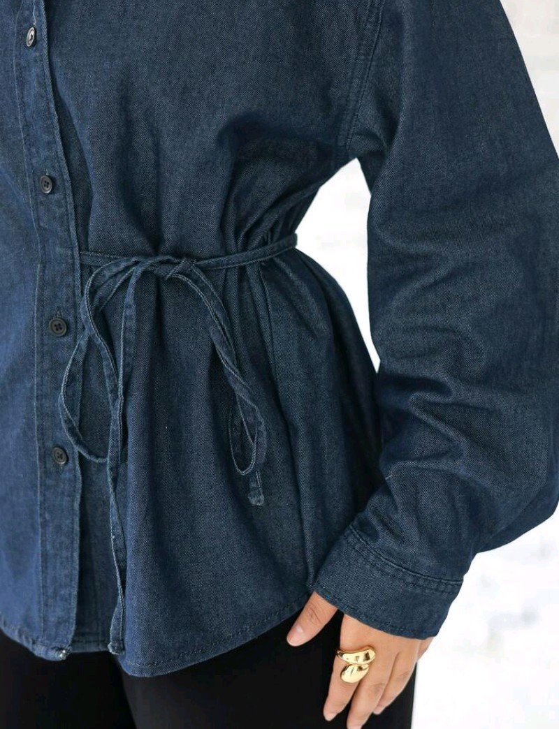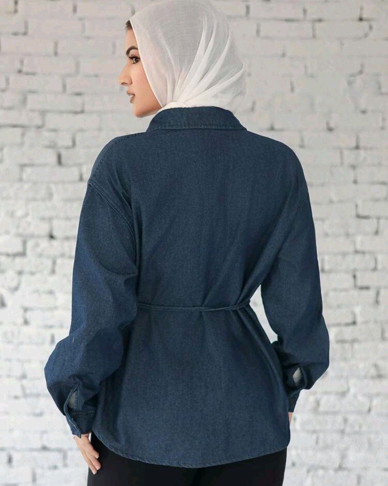 بلوزة جينز كاجوال بأكمام طويلة وياقة مفرودة وربطة للنساء، بلون أحادي، لموسم الربيع والصيف