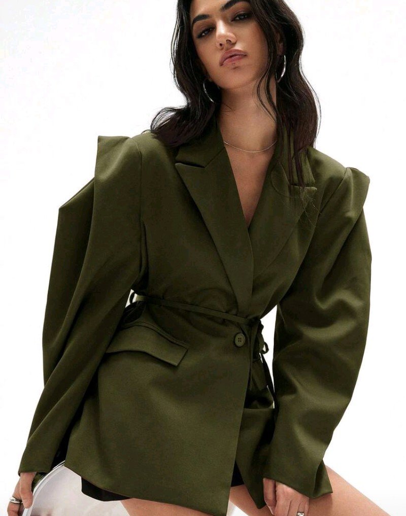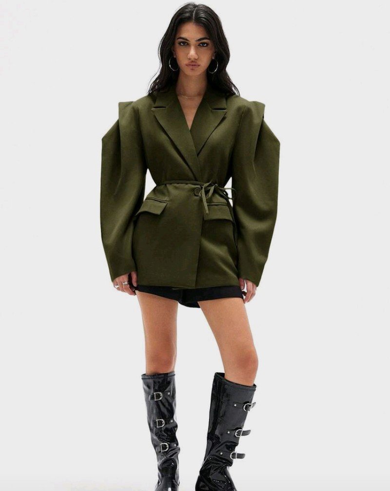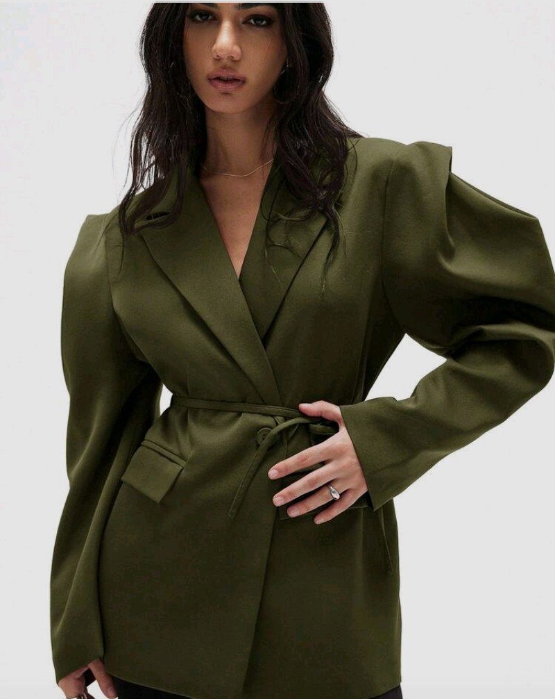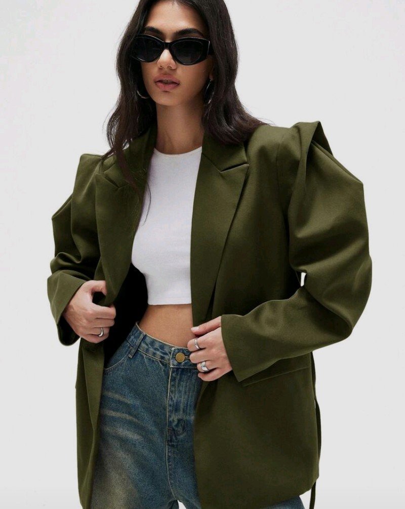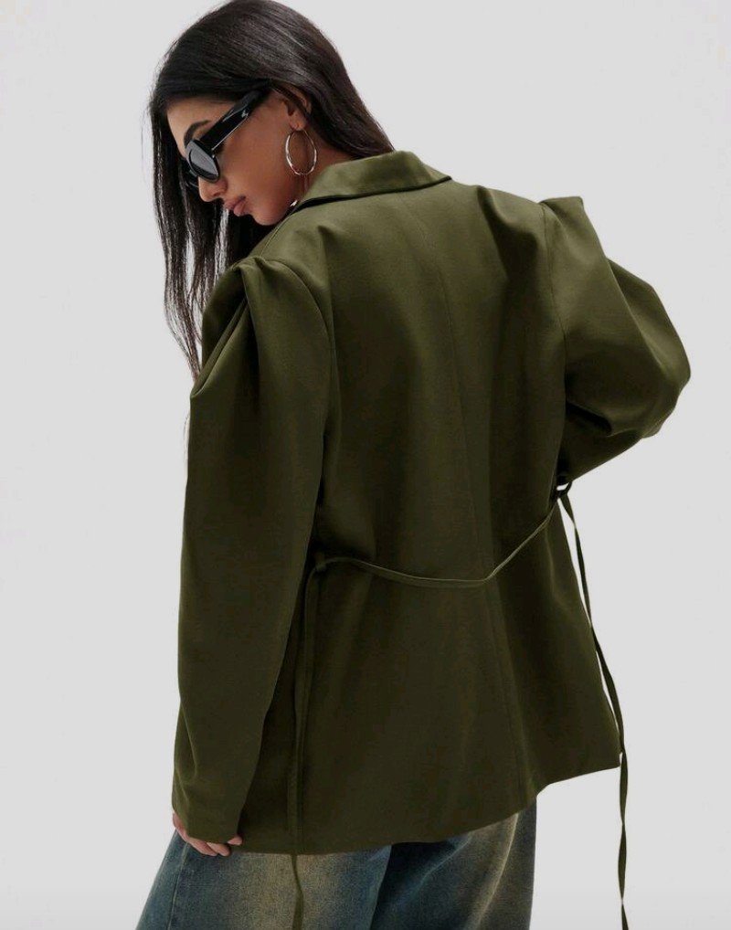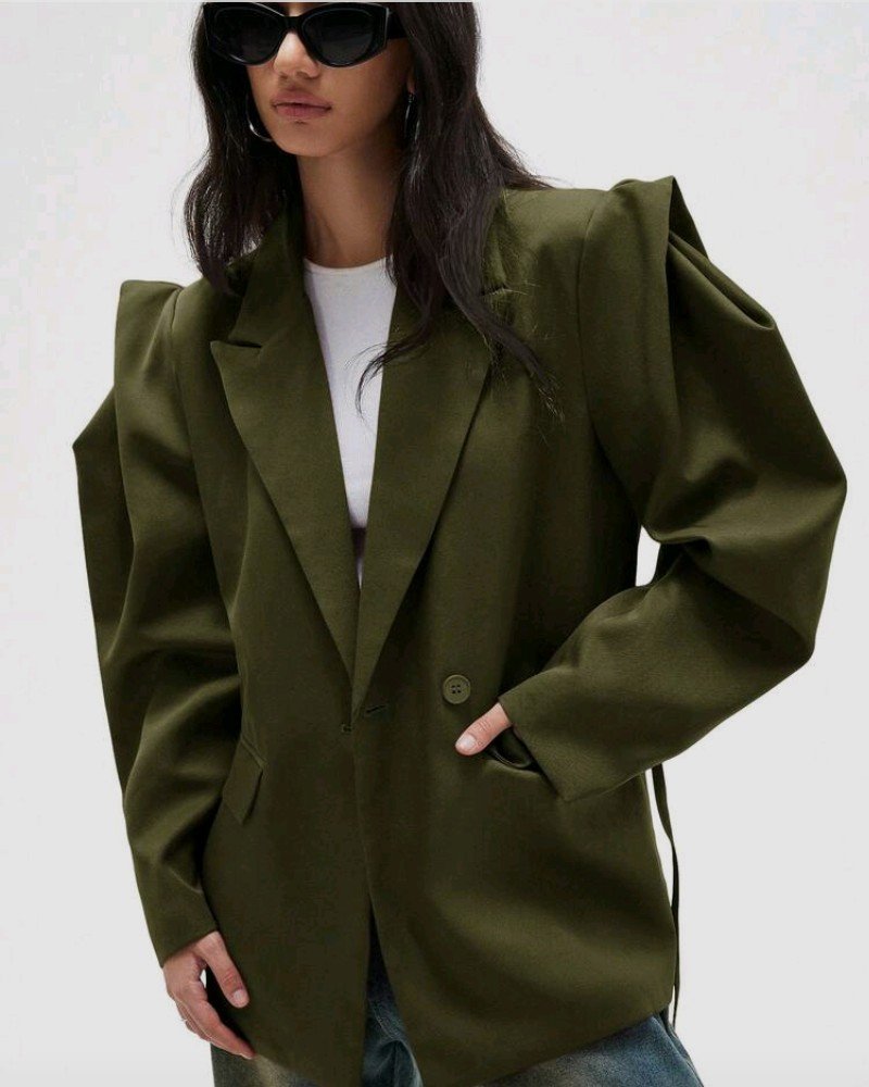 GENKIRA بليزر بتصميم واسع مريح للارتداء اليومي، ذو كتف عريض وخصر مربوط، بلون أحادي