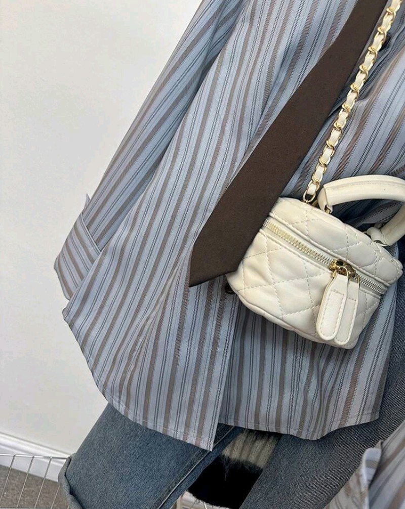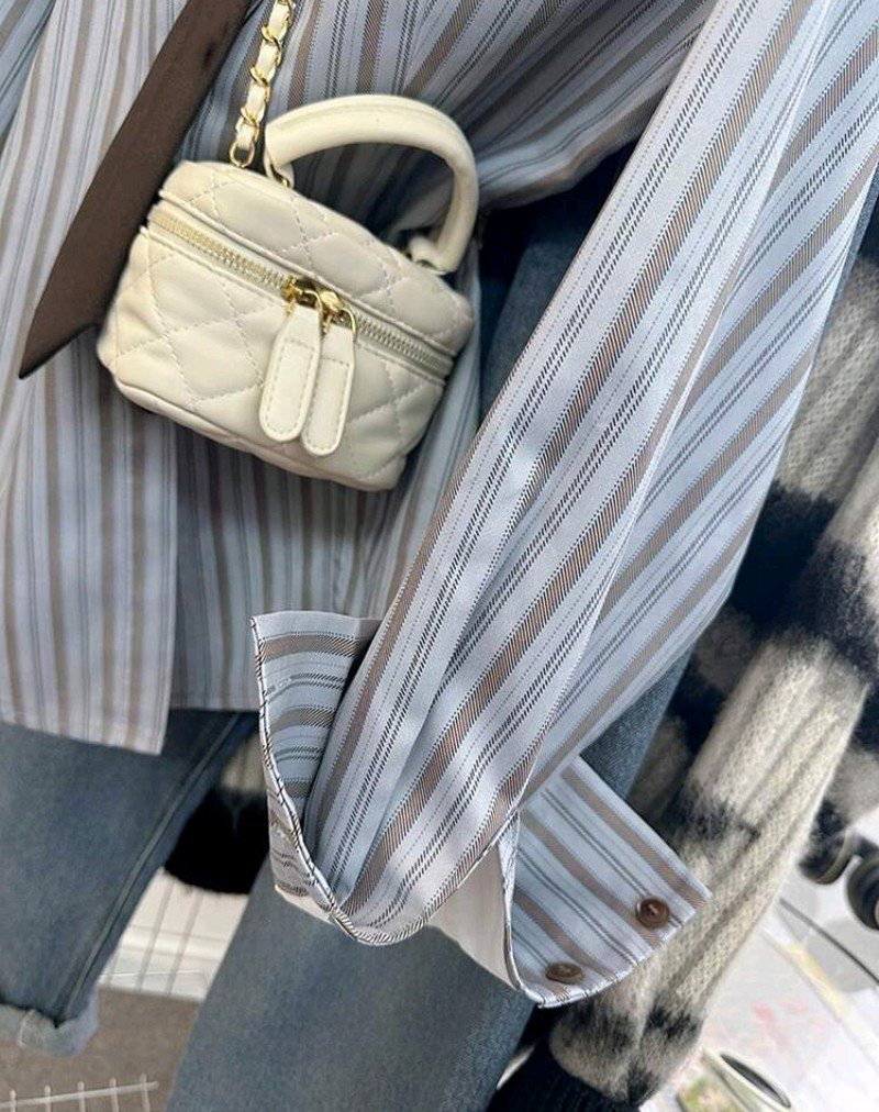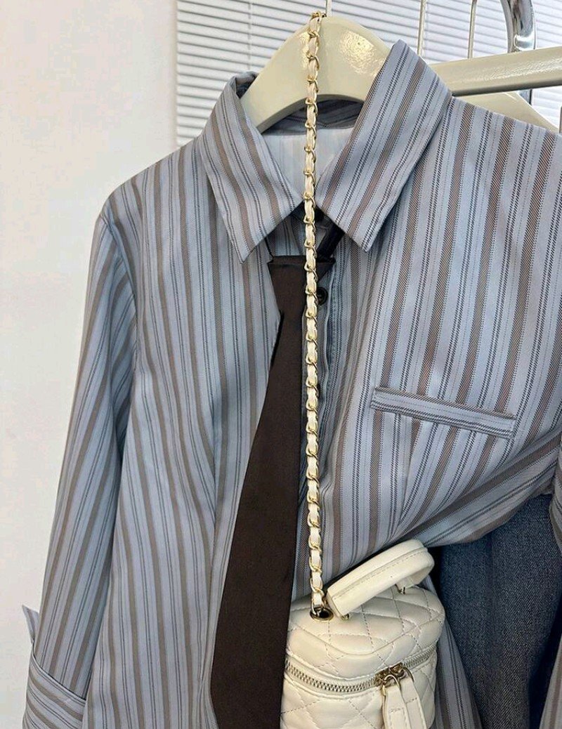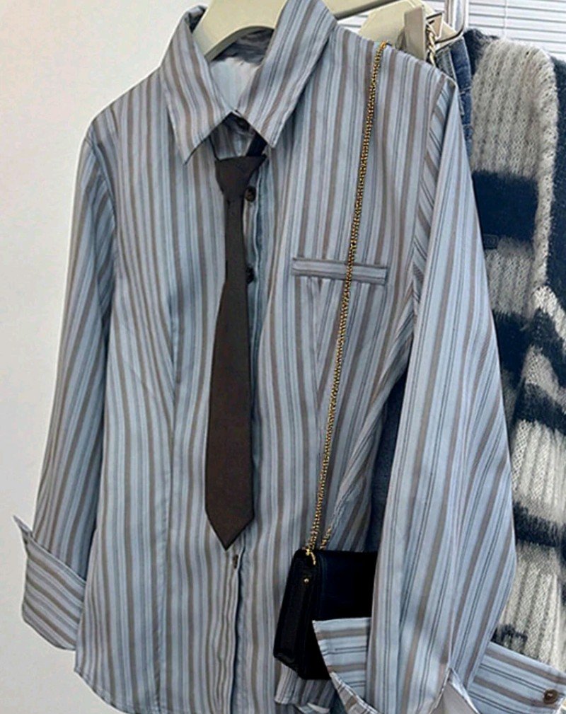 قميص نسائي أكمام طويلة مخطط  بأزرار وجيب على الصدر للصيف والمكتب والغداء والارتداء اليومي – مظهر عصري مبسط للربيع