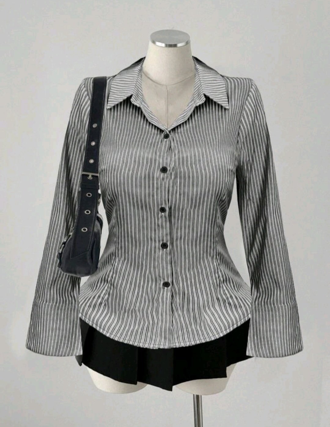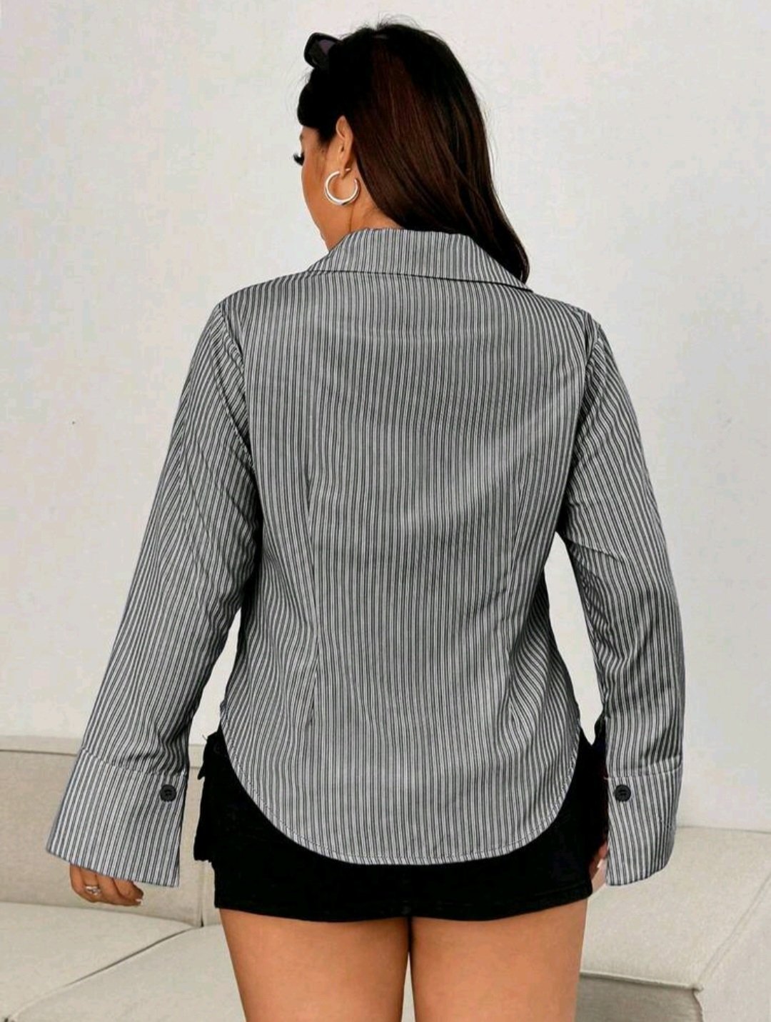 ملابس نسائيةقميص ستاتي مقاس كبير اتجاهات عمودية للنساء قميص مخطط خصر ضيق