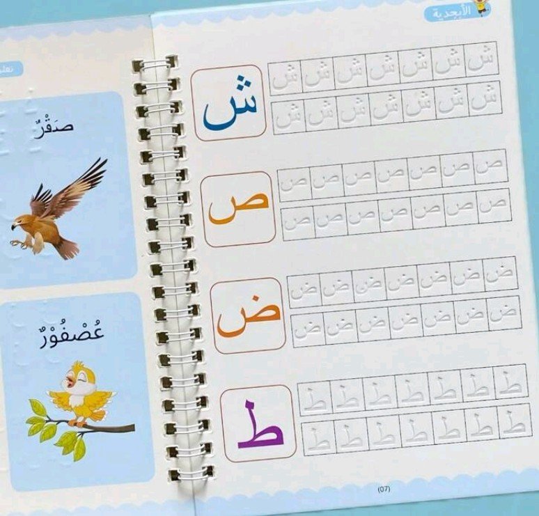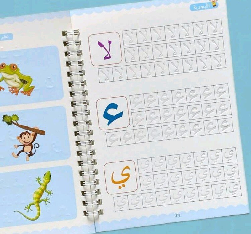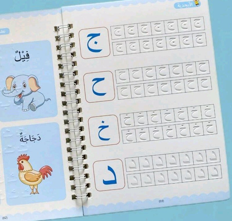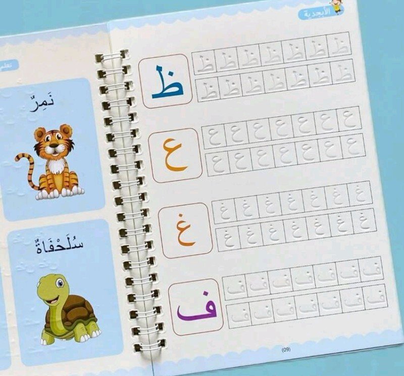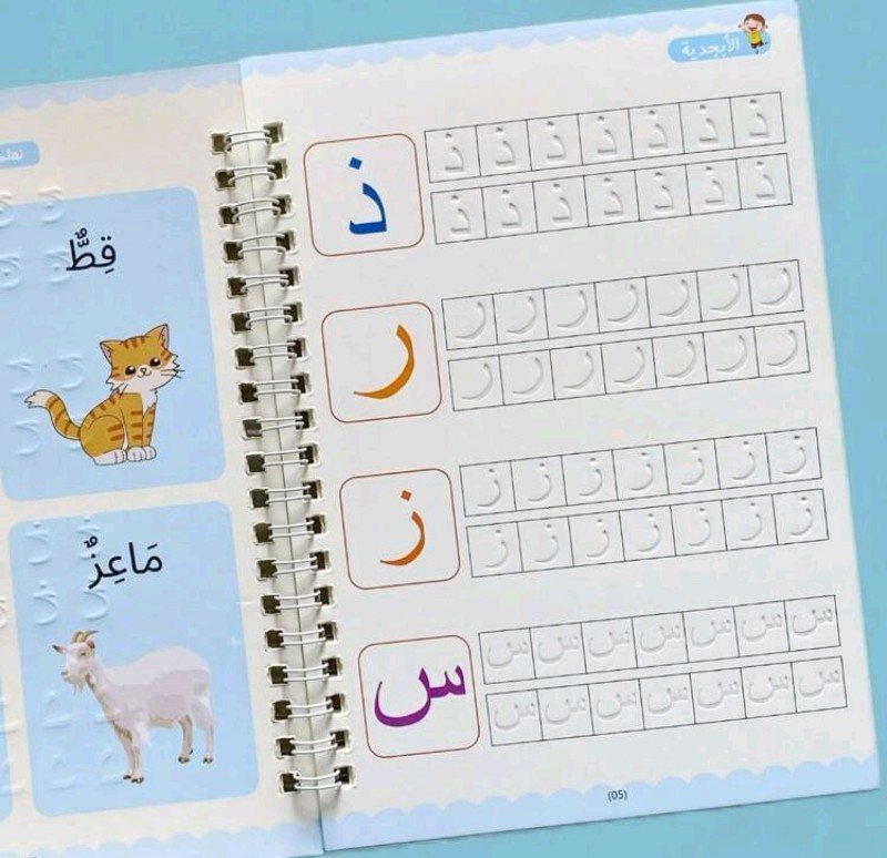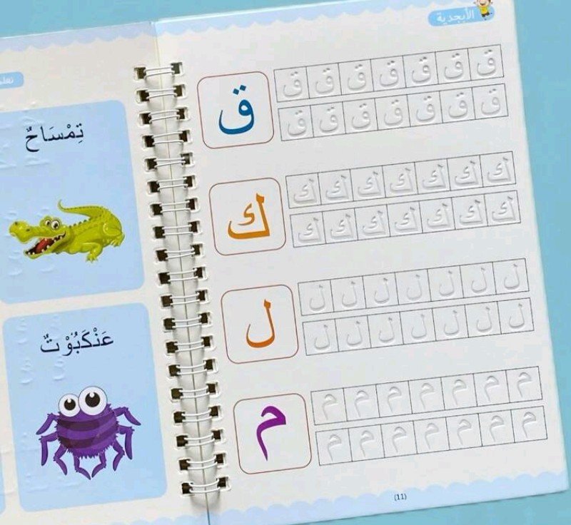 كتاب واحد من 16 صفحة، كتاب عمل للتدريب على الخط العربي – ورق أبيض مع حروف زرقاء وأرجوانية، تصميم مجوف لسهولة الكتابة، مثالي للتعلم والعودة إلى المدرسة والتدريب على الخط، لوازم الخط، كتاب تعليمي، غلاف مزخرف، ربطة حلزونية متينة، لوازم مدرسية، كتاب، معلم
