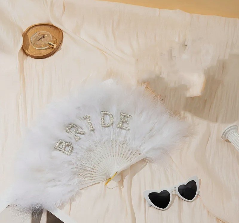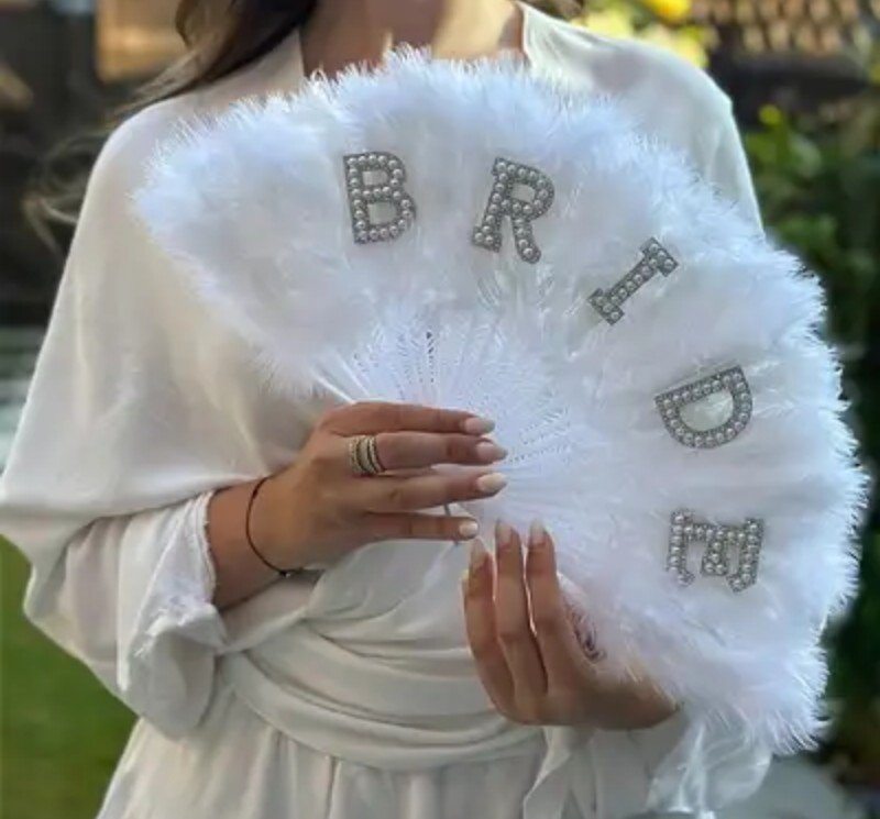 مروحة ريشة أنيقة للعروس مع حروف “BRIDE” لامعة ولمسات – إكسسوار زفاف أبيض للوصيفات، حفلات العرائس، عيد الحب، الرقص – هدية مروحة ريشة فاخرة للعرائس، هدايا الوصيفة، لمسة رومانسية، تصميم راقي، ديكور