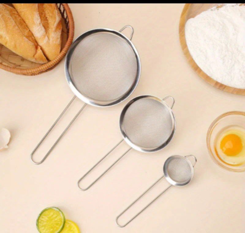 3 قطع مجموعة مصفاة شبكية ناعمة من الفولاذ المقاوم للصدأ مع ملعقة مثقبة ومقبض معدني – مصفاة دقيق متعددة الأحجام وفلتر زيت لتصفية الدقيق والعصير وأوراق الشاي المفكوكة والنودلز النباتية بكفاءة – مثالية للخبز والطهي والاستخدام المنزلي – شبكة معدنية متينة لتصفية الطعام، سلة فلتر شبكية من الفولاذ