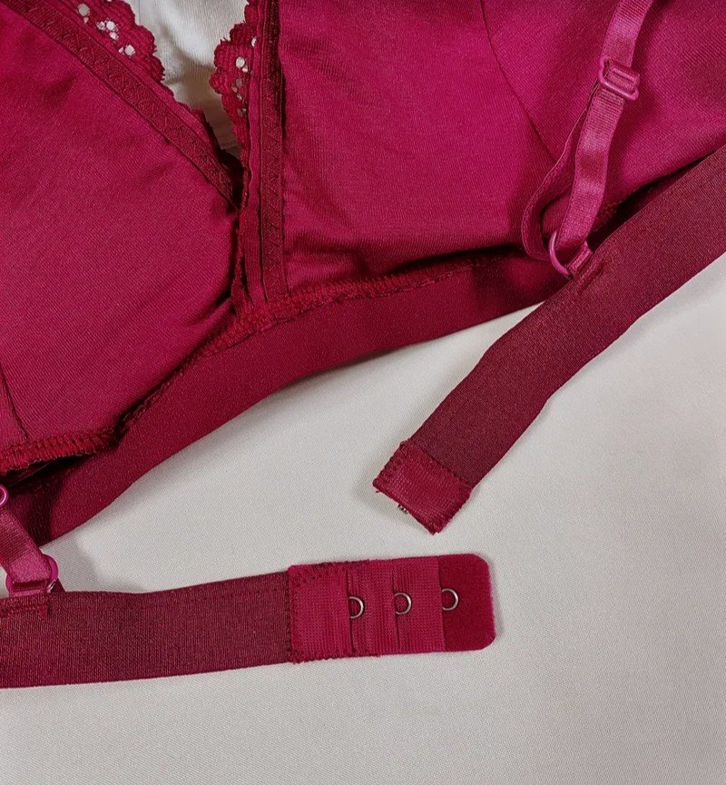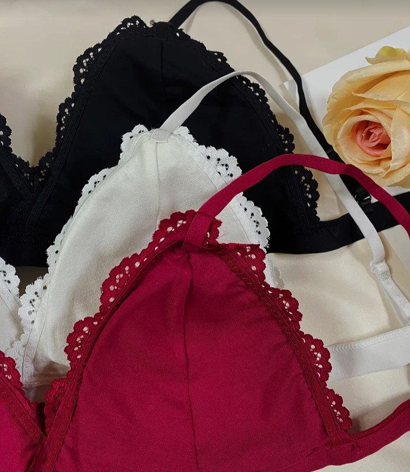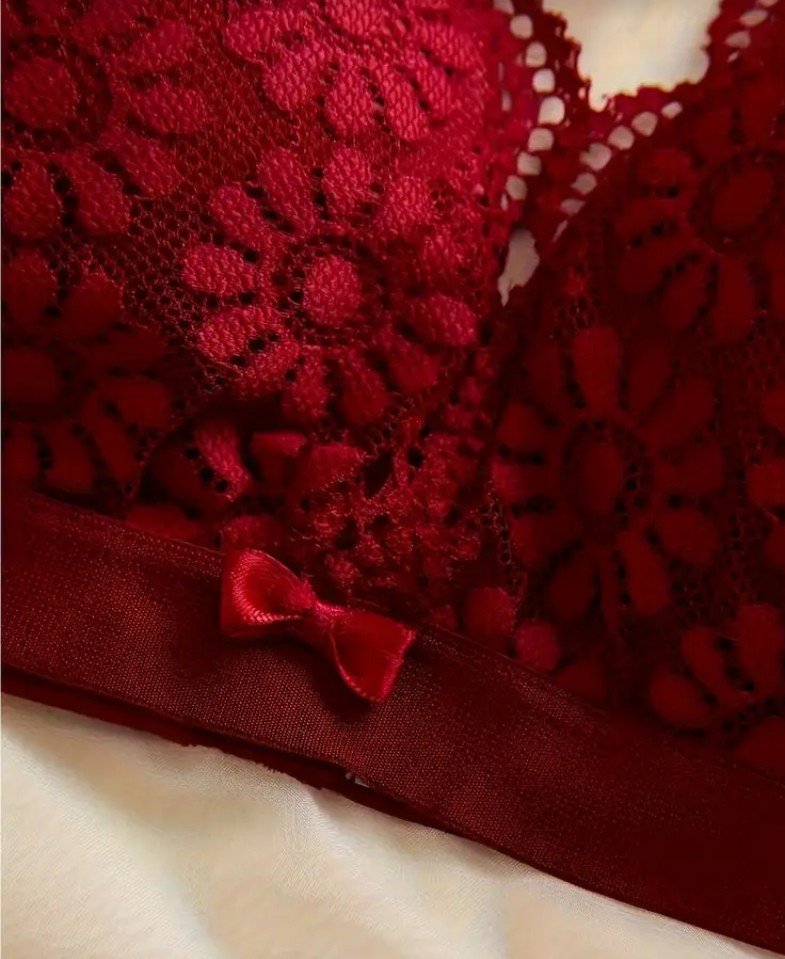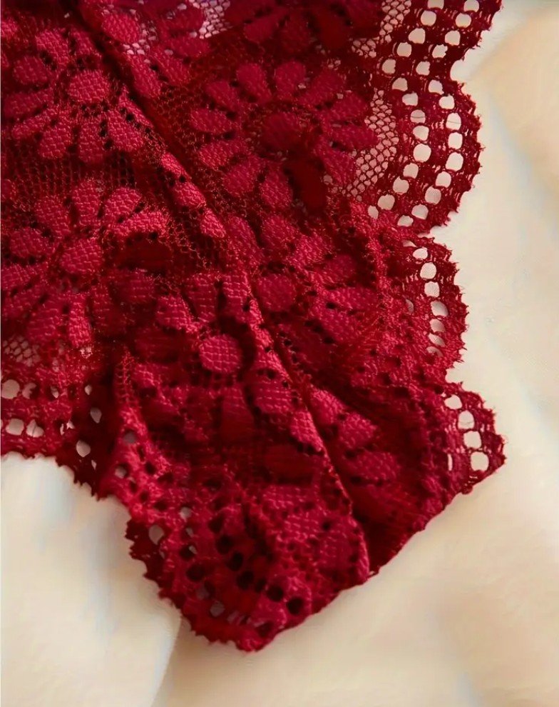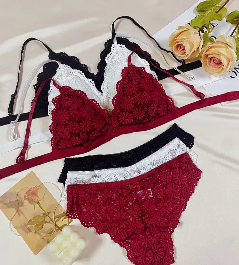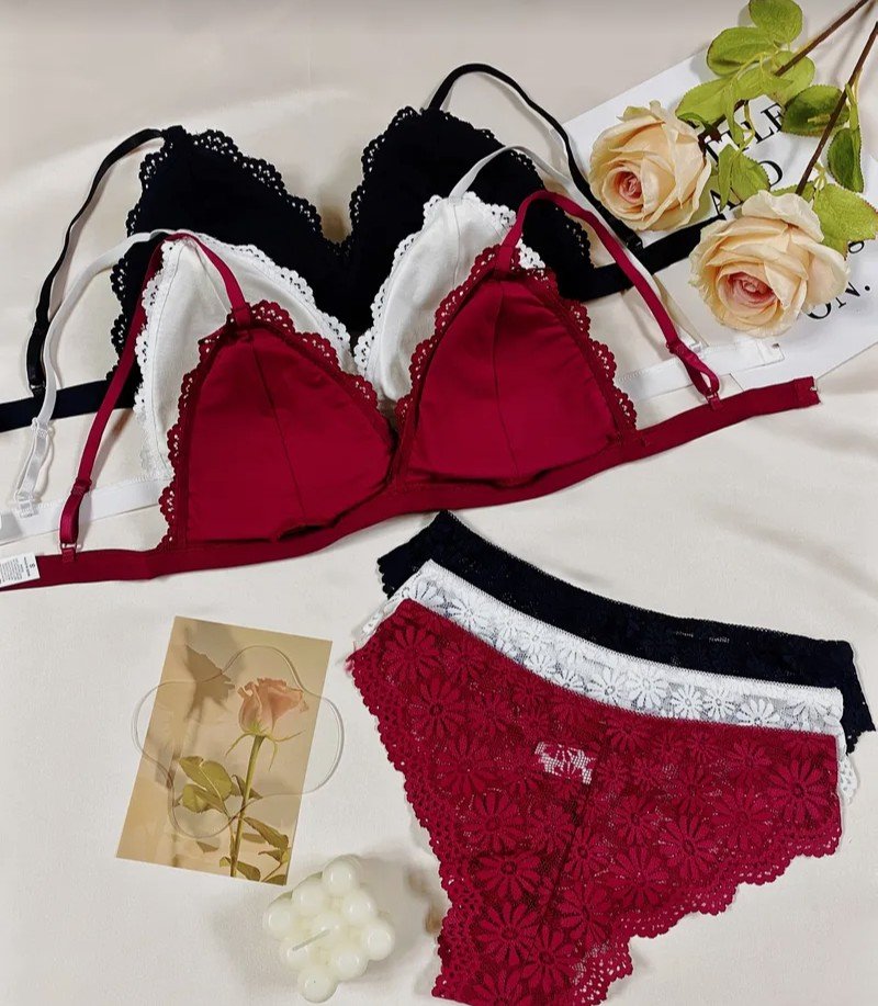 طقم ملابس داخلية نسائية مكون من 3 قطع بتصميم زهري دانتيل متباين، حمالة صدر رومانسية بكوب مثلث مع سراويل داخلية مزينة بالحواف المُشذبة